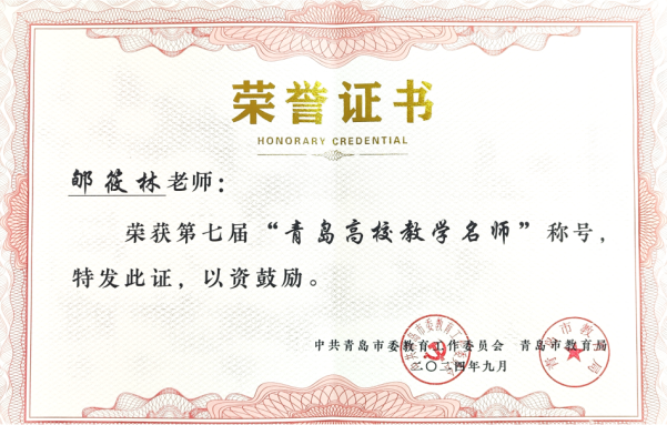 近日,中共青岛市委教育工作委员会、青岛市教育局公布第七届青岛高校教学名师授奖名单,威尼斯官网郇筱林副教授获“第七届青岛高校教学名师”荣誉称号。