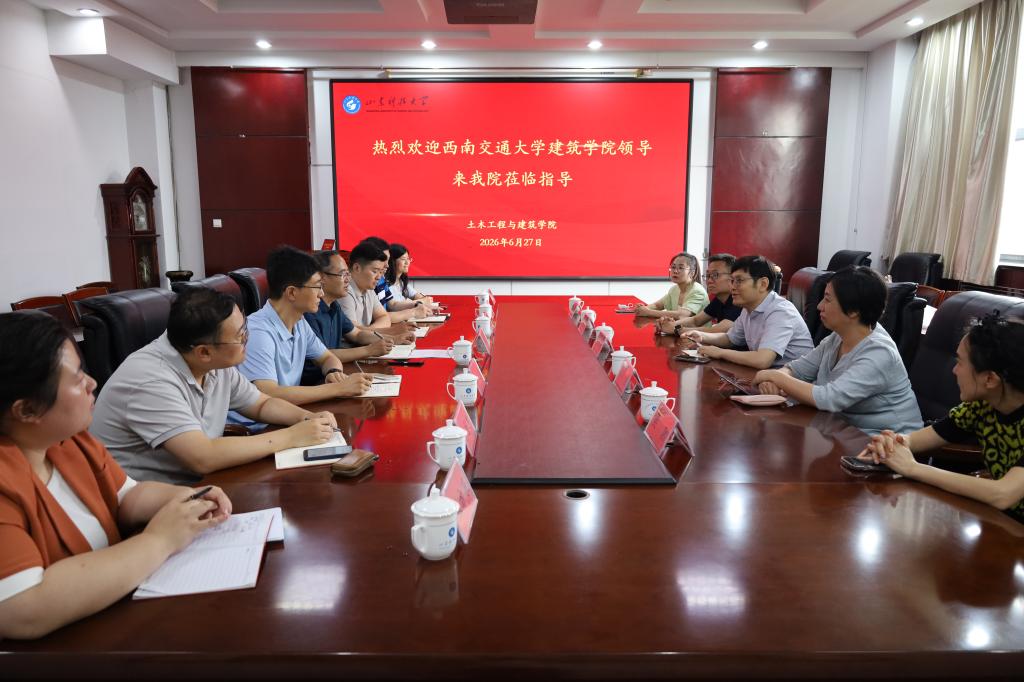 6月27日,西南交通大学建筑学院副院长崔叙、风景园林系系主任傅娅、城乡规划系副系主任唐由海、建筑系系助理吴聃及综合事务办公室主任孔翔榆一行到访威尼斯5139手机版。威尼斯5139手机版院长王崇革,副院长杨旭旭、都浩,党委委员、建筑与城乡规划系党支部书记代朋,建筑与城乡规划系主任付冠男,副主任王彦君,辅导员张方源陪同调研交流。