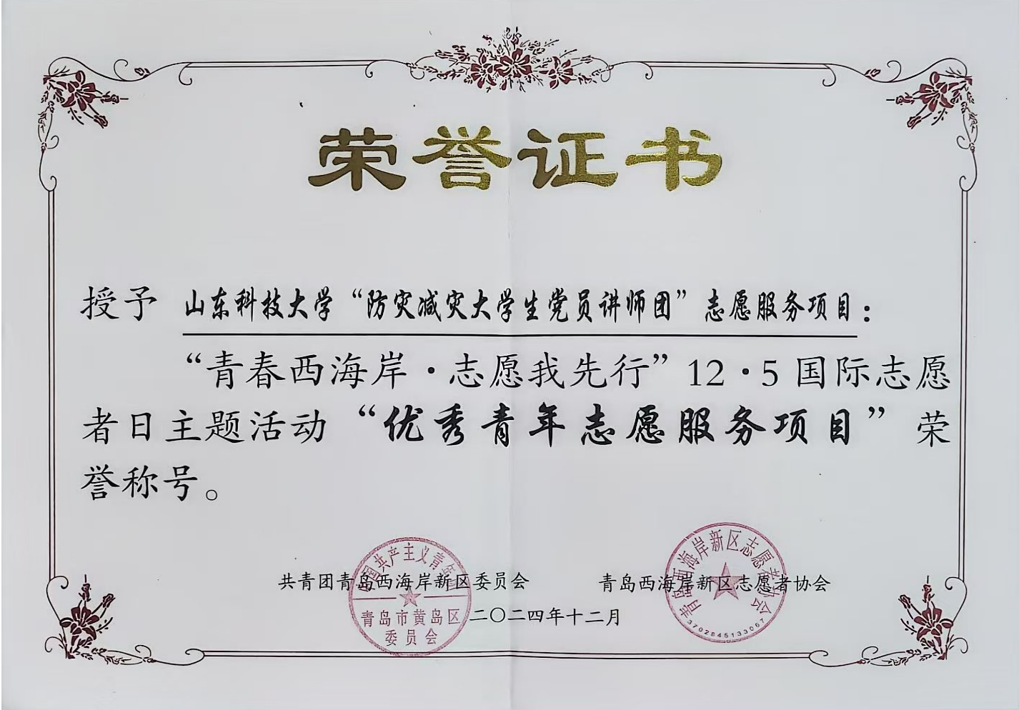 12月4日,在第39个国际志愿者日到来之际,西海岸新区团委举办“青春西海岸·志愿我先行”12·5国际志愿者日主题活动,表彰优秀青年志愿者、优秀青年志愿服务项目、优秀青年志愿服务工作者获奖代表以及驻区高校优秀青年大学生代表。威尼斯5139手机版防灾减灾大学生党员讲师团获“优秀青年志愿服务项目”荣誉称号,并作为唯一项目代表进行汇报展演。