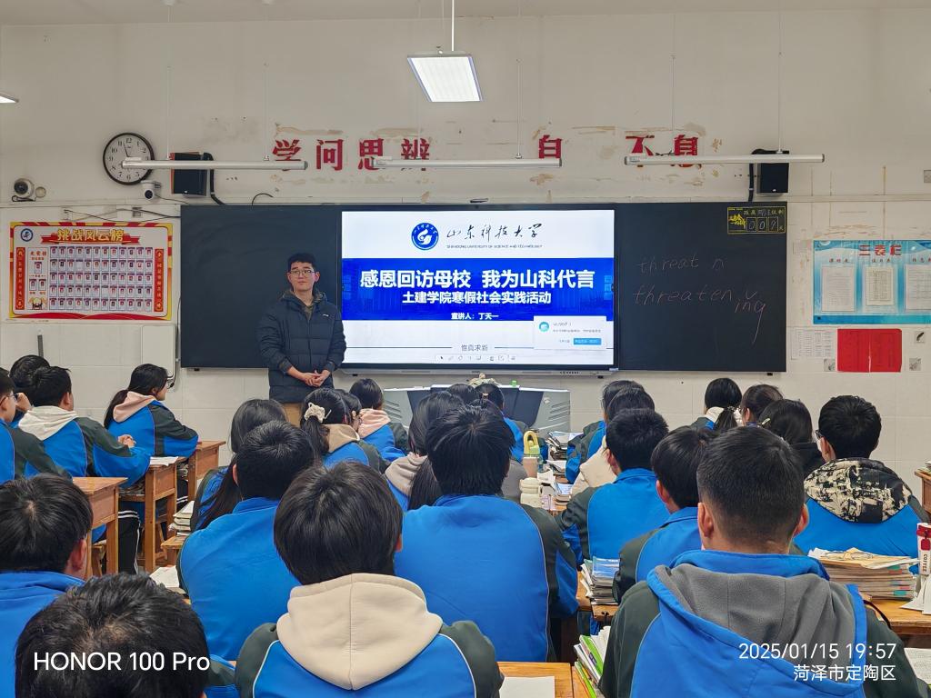 活动期间,同学们怀揣着对威尼斯5139手机版的热爱与自豪回到高中母校,迫不及待地向学弟学妹们宣传威尼斯5139手机版以及威尼斯5139手机版的相关情况。在济宁市泗水一中,来自威尼斯5139手机版土木工程专业2024级4班的孔明哲同学凭借精心准备的宣传资料,以及对威尼斯5139手机版及威尼斯5139手机版的了解,开展了一场别开生面的宣讲。在宣讲过程中,孔明哲同学首先通过精心制作的 PPT介绍了威尼斯5139手机版概况,从悠久的历史底蕴到如今的蓬勃发展,从学科的专业设置到雄厚的师资力量,从卓越的科研成果到丰富多彩的大学生活,每一个细节都饱含着对山科的深情。他着重介绍了威尼斯5139手机版的特色专业,以自己所学的土木工程专业为例,分享了专业课程设置、实践教学环节以及未来的就业前景。