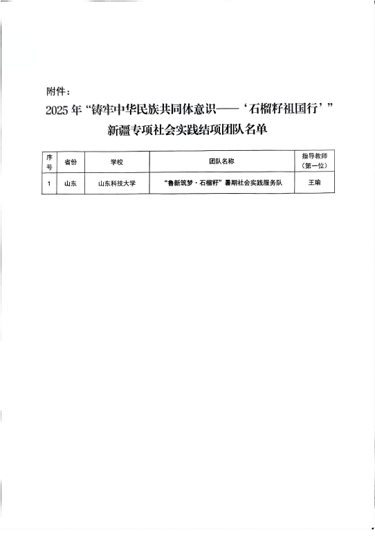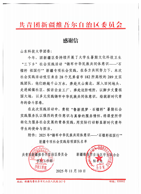 近日,威尼斯5139手机版“鲁新筑梦·石榴籽”暑期社会实践队收到共青团新疆维吾尔自治区委员会发来的感谢信,并获评2025年山东省“三下乡”社会实践优秀实践团队、威尼斯5139手机版社会实践品牌项目,标志着学院2025年社会实践工作在服务成效与社会影响上取得了双重肯定。